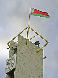 Drapeau et armoiries de la Biélorussie au poste-frontière de Terespol (Brest).