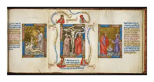- À gauche et à droite se trouvent deux autres vignettes (parfois plus petites) de scènes de l'ancien Testament préfigurant l’événement central ou ayant un lien spirituel ou théologique (selon la typologie biblique) avec lui.