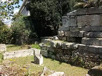 Ruines de la bibliothèque de Pantainos, la stoa d'Attale en arrière-plan.