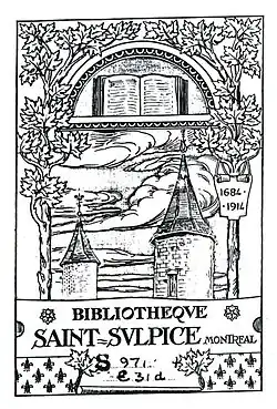 En 1914, à la demande de Fauteux, Guido Nincheri illustre l'ex-libris de la bibliothèque. Représentant deux tours, seul vestiges du fort érigés par les sulpiciens aux XVIIe siècle, on y remarque deux dates . La première, 1684, correspond à l'établissement du Séminaire de Notre-Dame tandis que 1914 est la date prévue de l'ouverture de la bibliothèque Saint-Sulpice [10].