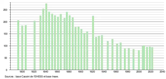 L'évolution du nombre d'habitants est connue à travers les recensements de la population effectués dans la commune depuis 1793. Pour les communes de moins de 10 000 habitants, une enquête de recensement portant sur toute la population est réalisée tous les cinq ans, les populations de référence des années intermédiaires étant quant à elles estimées par interpolation ou extrapolation[30]. Pour la commune, le premier recensement exhaustif entrant dans le cadre du nouveau dispositif a été réalisé en 2008[31].