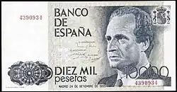 | En 1992, la Banque d'Espagne a publié sa dernière série avant l'introduction de l'Euro. Les billets ont été faits par l'artiste graphique Reinhold Gerstetter et imprimé par la "Fábrica Nacional de Moneda y Timbre". L'objectif de la Banque d'Espagne, la question de cette nouvelle série était de renforcer la sécurité à travers des micro-texte imprimé et indices visible uniquement avec une loupe. Cette série de billets combine des éléments artistiques espagnols et américains pour célébrer en le 500e anniversaire de la découverte de l'Amérique par Christophe Colomb. | ||||||||||||