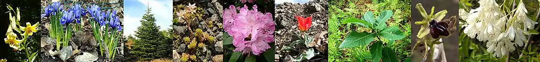 Avec ses reliefs contrastés et ses grandes variations climatiques le Caucase possède une flore très riche qui s'élève à 6 400 espèces de plantes vasculaires (en proportion les États-Unis avec un territoire 18 fois plus grand possèdent moins de 20 000 espèces végétales), parmi lesquelles on retrouve environ 1 600 espèces endémiques. Il existe également 17 genres endémiques, dont 9 sont associés à des écosystèmes de hautes montagnes. L'endémisme est très important dans les zones d'éboulis rocheux, c'est le cas pour la flore du Colchide dont 80 % des espèces sont endémiques aux éboulis calcaires de cette région. On dénombre environ 150 espèces d'arbres dont 32 espèces menacées (CR, EN, VU). On retrouve plusieurs espèces de conifères comme (Pin de Calabre, Sapin de Nordmann), de chênes (Chêne du Pontin), de saules. La Parrotie de Perse (Parrotia persica) est endémique à la Chaîne de l'Elbourz, quant au Staphylier de Colchide (Staphylea colchica) il est propre à la Géorgie. On retrouve également plusieurs espèces de rhododendrons endémiques: Rhododendron caucasicum, Rhododendron ungernii, Rhododendron smirnowii. De plus cette région comporte un grand nombre de souches relictuelles de plantes aujourd'hui cultivées comme du seigle, du blé, de l'orge, ainsi que des fruits à coque ou des pommiers et des abricotiers. De plus on trouve une grande concentration d'espèces de poiriers: Pyrus demetrii, Pyrus eldarica, Pyrus sachokiana, Pyrus ketzkhoveli, toutes quatre en danger (EN). On retrouve également de nombreuses espèces herbacées: Liliaceae, Iridaceae, Asteraceae, Ranunculaceae, Violaceae, etc[2].