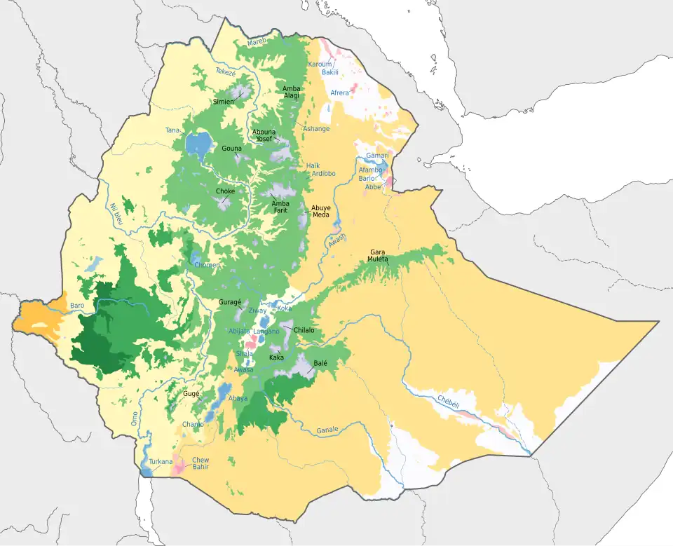L'histoire géologique de l'Éthiopie est caractérisée par des périodes de surrections et de formation de rifts. Les hauts plateaux abyssins sont divisés en deux régions, nord-ouest et sud-est, par la vallée du Grand Rift, apparue à partir de 75 ma. Pendant les périodes glaciaires, une série d'escarpements et de djebels le long de la mer Rouge a permis une connexion avec les biomes tempérés d'Afrique du Nord et de la péninsule Arabique, ce qui a créé une route de colonisation pour diverses espèces paléarctiques. À l'inverse, Le désert kenyan au sud et les grandes plaines d'inondation du Nil à l'ouest constituent un barrière naturelle qui a limité l'immigration de nouvelles espèces végétales et animales[3].