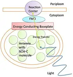Diverses structures, telles que le complexe FMO des bactéries vertes sulfureuses, sont responsables du transfert de l'énergie des antennes vers un site de réaction. Les études en spectroscopie électronique FT sur l'absorption et le transfert d'électrons montrent une efficacité supérieure à 99 %[10], qui ne peut être expliquée par les modèles mécaniques classiques comme le modèle de diffusion. On les a donc remis en question et dès 1938, les scientifiques ont théorisé que la cohérence quantique était le mécanisme du transfert d'énergie d'excitation.
