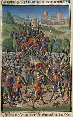 Bituit, roi des auvergnats, mis en prison, miniature médiévale issue du De casibus de Boccace. XVe siècle, BnF. | |
