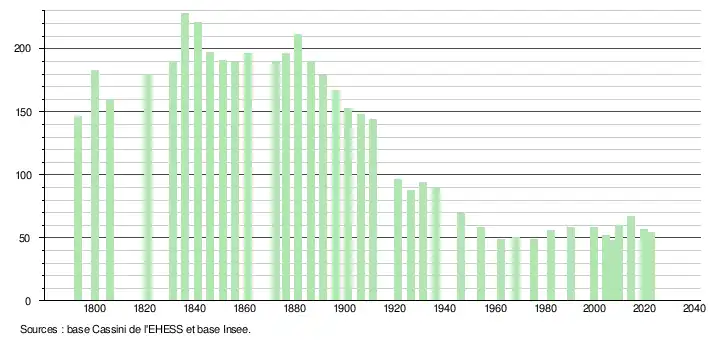 L'évolution du nombre d'habitants est connue à travers les recensements de la population effectués dans la commune depuis 1793. Pour les communes de moins de 10 000 habitants, une enquête de recensement portant sur toute la population est réalisée tous les cinq ans, les populations de référence des années intermédiaires étant quant à elles estimées par interpolation ou extrapolation[20]. Pour la commune, le premier recensement exhaustif entrant dans le cadre du nouveau dispositif a été réalisé en 2004[21].