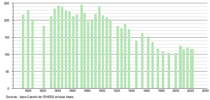 L'évolution du nombre d'habitants est connue à travers les recensements de la population effectués dans la commune depuis 1793. Pour les communes de moins de 10 000 habitants, une enquête de recensement portant sur toute la population est réalisée tous les cinq ans, les populations de référence des années intermédiaires étant quant à elles estimées par interpolation ou extrapolation[42]. Pour la commune, le premier recensement exhaustif entrant dans le cadre du nouveau dispositif a été réalisé en 2005[43].