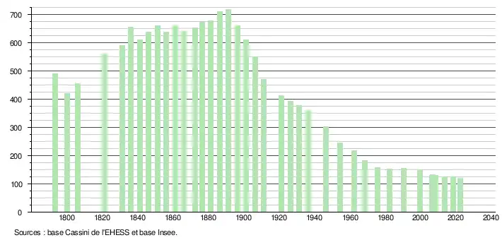 L'évolution du nombre d'habitants est connue à travers les recensements de la population effectués dans la commune depuis 1793. Pour les communes de moins de 10 000 habitants, une enquête de recensement portant sur toute la population est réalisée tous les cinq ans, les populations de référence des années intermédiaires étant quant à elles estimées par interpolation ou extrapolation[13]. Pour la commune, le premier recensement exhaustif entrant dans le cadre du nouveau dispositif a été réalisé en 2008[14].