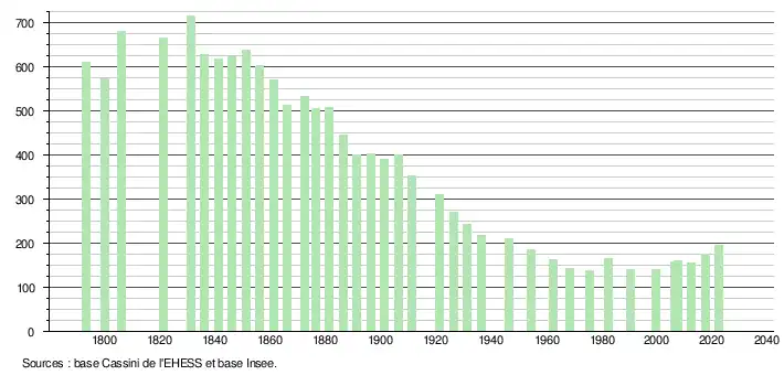L'évolution du nombre d'habitants est connue à travers les recensements de la population effectués dans la commune depuis 1793. Pour les communes de moins de 10 000 habitants, une enquête de recensement portant sur toute la population est réalisée tous les cinq ans, les populations de référence des années intermédiaires étant quant à elles estimées par interpolation ou extrapolation[23]. Pour la commune, le premier recensement exhaustif entrant dans le cadre du nouveau dispositif a été réalisé en 2007[24].
