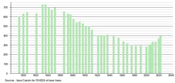 L'évolution du nombre d'habitants est connue à travers les recensements de la population effectués dans la commune depuis 1793. Pour les communes de moins de 10 000 habitants, une enquête de recensement portant sur toute la population est réalisée tous les cinq ans, les populations de référence des années intermédiaires étant quant à elles estimées par interpolation ou extrapolation[22]. Pour la commune, le premier recensement exhaustif entrant dans le cadre du nouveau dispositif a été réalisé en 2004[23].