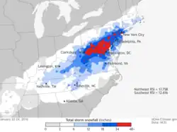 Aux États-Unis, la tempête a affecté une large portion du centre-est du pays, laissant plus de 30 centimètres entre le Kentucky et Boston, avec une zone de plus de 60 centimètres des Appalaches jusqu'à New York et un maximum de 168 centimètres au mont Mitchell dans le nord-ouest de la Caroline du Nord[61],[62].