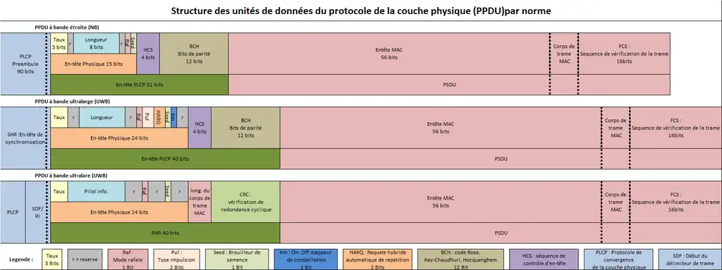 Afin de transmettre des données binaires sur le support sans fil, on doit passer par un modulateur numérique-analogique[46]. Dans ces trois normes, les structures PPDU (physical layer protocol data unit) varient et les modulations aussi. Ce qui a pour effet de modifier les caractéristiques de performance, de débit et de portée[47].