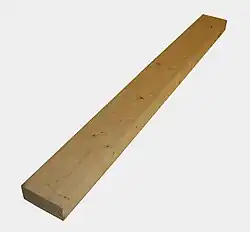 - Forme carrée ou rectangulaire: Plank, slat, batten, board, lath, strapping (typically 3⁄4 in × 1+1⁄2 in), cant (une bûche partiellement sciée, telle que sciée sur deux côtés ou équarrie à une grande taille, puis resciée en bois d'œuvre. Un flitch est un type de sciage avec flache sur un ou les deux côtés destiné à d'autres conversions (quartelot[15]). Diverses pièces sont également connues par leurs utilisations telles que post, beam, (girt), stud, rafter, joist, sill plate, wall plate.