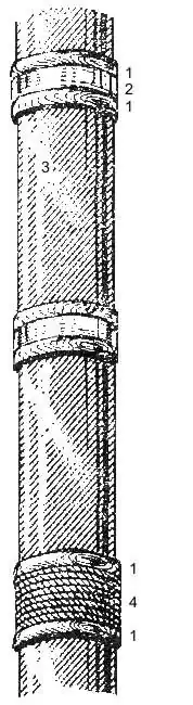 Les gros mâts sont les plus composés[4]; les pièces étant réunies, on arrondit les mâts et on en maintient définitivement l'assemblage avec des cerclages chassés à chaud[1]. L'assemblage des vergues principales est, ainsi que celui des mâts, contenu par des cercles de fer qui les ceignent à 3 pieds de distance les uns des autres sur toute la longueur d'un mât, depuis les jottereaux jusqu'au pied, et d'un capelage de vergue à l'autre[4].