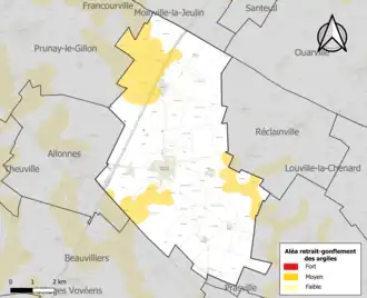 Le retrait-gonflement des sols argileux est susceptible d'engendrer des dommages importants aux bâtiments en cas d’alternance de périodes de sécheresse et de pluie. 18,3 % de la superficie communale est en aléa moyen ou fort (52,8 % au niveau départemental et 48,5 % au niveau national). Sur les 358 bâtiments dénombrés sur la commune en 2019, 2 sont en aléa moyen ou fort, soit 1 %, à comparer aux 70 % au niveau départemental et 54 % au niveau national. Une cartographie de l'exposition du territoire national au retrait gonflement des sols argileux est disponible sur le site du BRGM[17],[Carte 2].