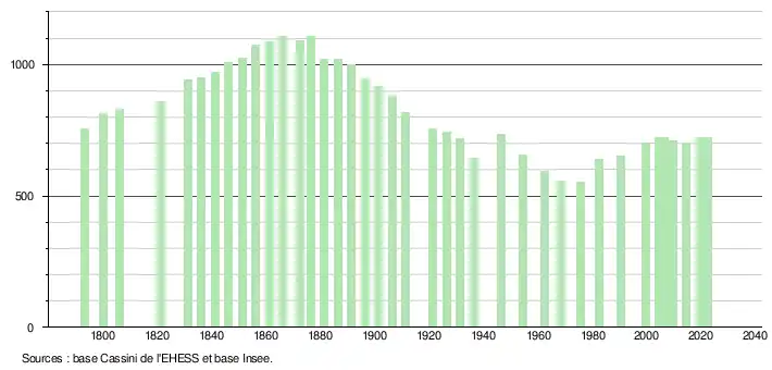 L'évolution du nombre d'habitants est connue à travers les recensements de la population effectués dans la commune depuis 1793. Pour les communes de moins de 10 000 habitants, une enquête de recensement portant sur toute la population est réalisée tous les cinq ans, les populations de référence des années intermédiaires étant quant à elles estimées par interpolation ou extrapolation[28]. Pour la commune, le premier recensement exhaustif entrant dans le cadre du nouveau dispositif a été réalisé en 2004[29].