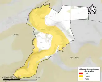 Le retrait-gonflement des sols argileux est susceptible d'engendrer des dommages importants aux bâtiments en cas d’alternance de périodes de sécheresse et de pluie. 52,7 % de la superficie communale est en aléa moyen ou fort (52,8 % au niveau départemental et 48,5 % au niveau national). Sur les 152 bâtiments dénombrés sur la commune en 2019, 86 sont en aléa moyen ou fort, soit 57 %, à comparer aux 70 % au niveau départemental et 54 % au niveau national. Une cartographie de l'exposition du territoire national au retrait gonflement des sols argileux est disponible sur le site du BRGM[17],[Carte 2].