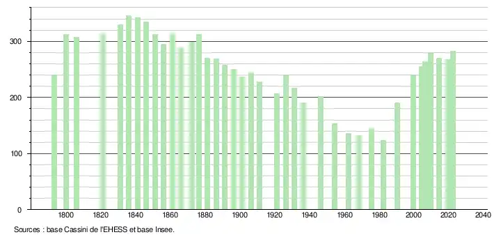 L'évolution du nombre d'habitants est connue à travers les recensements de la population effectués dans la commune depuis 1793. Pour les communes de moins de 10 000 habitants, une enquête de recensement portant sur toute la population est réalisée tous les cinq ans, les populations de référence des années intermédiaires étant quant à elles estimées par interpolation ou extrapolation[22]. Pour la commune, le premier recensement exhaustif entrant dans le cadre du nouveau dispositif a été réalisé en 2004[23].