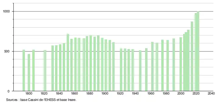 L'évolution du nombre d'habitants est connue à travers les recensements de la population effectués dans la commune depuis 1793. Pour les communes de moins de 10 000 habitants, une enquête de recensement portant sur toute la population est réalisée tous les cinq ans, les populations de référence des années intermédiaires étant quant à elles estimées par interpolation ou extrapolation[16]. Pour la commune, le premier recensement exhaustif entrant dans le cadre du nouveau dispositif a été réalisé en 2004[17].