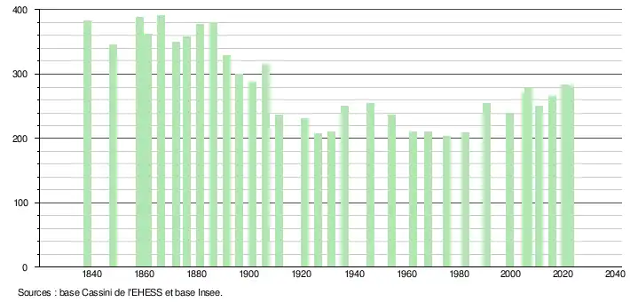 L'évolution du nombre d'habitants est connue à travers les recensements de la population effectués dans la commune depuis 1838. Pour les communes de moins de 10 000 habitants, une enquête de recensement portant sur toute la population est réalisée tous les cinq ans, les populations de référence des années intermédiaires étant quant à elles estimées par interpolation ou extrapolation[13]. Pour la commune, le premier recensement exhaustif entrant dans le cadre du nouveau dispositif a été réalisé en 2005[14].