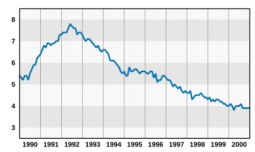 Politiquement, la morosité économique fragilisa la candidature du président en exercice George H.W. Bush à l'élection de 1992. Le candidat démocrate, Bill Clinton profita de la morosité économique et de l'usure de l'administration républicaine après 12 années de présidence. Le chômage ne descendit pas sous la barre des 7 % avant et 6 % avant .