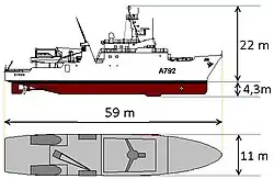 | Équipage | 4 officiers dont 1 ingénieur, 19 officiers mariniers, 13 quartiers-maîtres et matelots, 9 hydrographes |