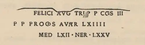 - Pio] Felici Aug(usto) trib(unicia) p(otestate) co(n)s(uli) III / p(atri) p(atriae) proco(n)s(uli) Avar(ico) l(eugas) XIIII / Med(iolanio) l(eugas) XII Ner(iomago) l(eugas) XXV