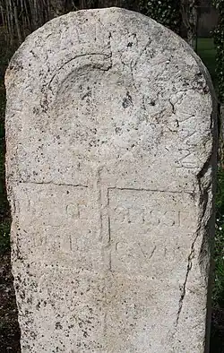 Borne frontière en pierre sculptée de forme fenêtre romane.