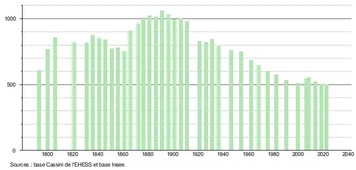 L'évolution du nombre d'habitants est connue à travers les recensements de la population effectués dans la commune depuis 1793. Pour les communes de moins de 10 000 habitants, une enquête de recensement portant sur toute la population est réalisée tous les cinq ans, les populations de référence des années intermédiaires étant quant à elles estimées par interpolation ou extrapolation[18]. Pour la commune, le premier recensement exhaustif entrant dans le cadre du nouveau dispositif a été réalisé en 2008[19].