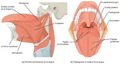 La langue, organe musculaire, est responsable du goût par l'intermédiaire des papilles gustatives, mais aussi de la phonation et de la bonne mastication du bol alimentaire.
