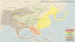 Le bouddhisme qui s'implante en Chine est pour l'essentiel du Mahayana. Progressivement un bouddhisme proprement sinisé se développe, notamment à la suite de débats et emprunts avec le confucianisme et le taoïsme. Le courant de la Terre pure du Bouddha Amitabha connaît rapidement un succès à l'époque médiévale, à la suite de Huiyuan (334-416). Le Sutra du Lotus connaît un également grand succès, par le biais de l'école Tiantai fondée au VIe siècle par Zhiyi (538-597). L'école Huayan, fondée par Fazang (643-712) se repose quant à elle sur le Sutra de la guirlande (de fleurs). L'émergence du Chan, issu de l'école de la méditation, dont le fondateur supposé est Bodhidharma, conclut la période faste de développement d'écoles bouddhistes chinoises[122].