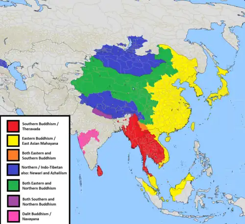 De grands regroupements ont pu être opérés. Peter Harvey, avec d'autres, met en avant « trois grandes régions culturelles » où le bouddhisme demeure courant : un « bouddhisme du Sud », autour du Theravada, au Sri-Lanka, en Birmanie, en Thaïlande, au Cambodge, au Laos, et dans leur voisinage ; un « bouddhisme de l'Est », autour du Mahayana dans son développement chinois, en Chine, en Corée, au Japon et au Vietnam ; et un « bouddhisme du Nord » dans la région de tradition tibétaine, autour du Mantrayana, au Tibet, en Mongolie, dans l'Himalaya, les régions orientales de la Chine[17],[18].