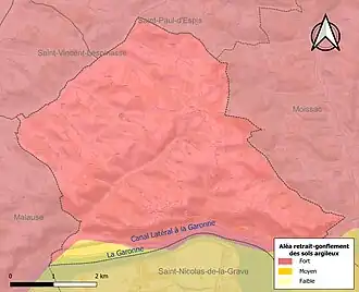 Le retrait-gonflement des sols argileux est susceptible d'engendrer des dommages importants aux bâtiments en cas d’alternance de périodes de sécheresse et de pluie. La totalité de la commune est en aléa moyen ou fort (92 % au niveau départemental et 48,5 % au niveau national). Sur les 343 bâtiments dénombrés sur la commune en 2019, 343 sont en aléa moyen ou fort, soit 100 %, à comparer aux 96 % au niveau départemental et 54 % au niveau national. Une cartographie de l'exposition du territoire national au retrait gonflement des sols argileux est disponible sur le site du BRGM[30],[Carte 3].
