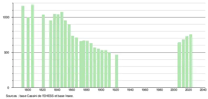 | L'évolution du nombre d'habitants est connue à travers les recensements de la population effectués dans la commune depuis 1793. Pour les communes de moins de 10 000 habitants, une enquête de recensement portant sur toute la population est réalisée tous les cinq ans, les populations de référence des années intermédiaires étant quant à elles estimées par interpolation ou extrapolation[35]. Pour la commune, le premier recensement exhaustif entrant dans le cadre du nouveau dispositif a été réalisé en 2007[36]. En 2022, la commune comptait 755 habitants[Note 10], en évolution de +3,85 % par rapport à 2016 (Tarn-et-Garonne : +3,12 %, France hors Mayotte : +2,11 %). |