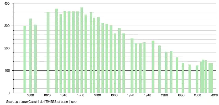 L'évolution du nombre d'habitants est connue à travers les recensements de la population effectués dans la commune depuis 1793. Pour les communes de moins de 10 000 habitants, une enquête de recensement portant sur toute la population est réalisée tous les cinq ans, les populations de référence des années intermédiaires étant quant à elles estimées par interpolation ou extrapolation[3]. Pour la commune, le premier recensement exhaustif entrant dans le cadre du nouveau dispositif a été réalisé en 2004[4].