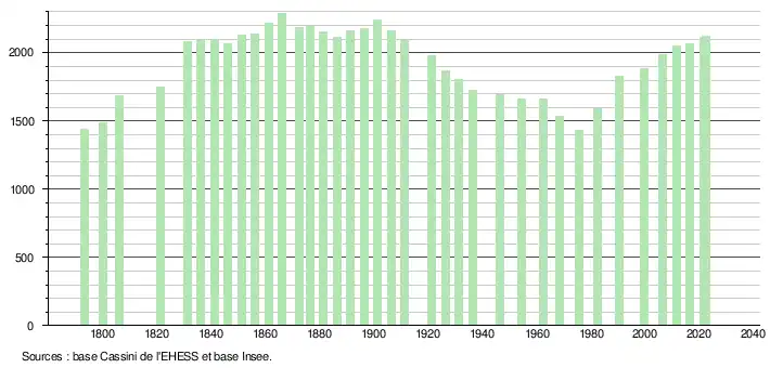 L'évolution du nombre d'habitants est connue à travers les recensements de la population effectués dans la commune depuis 1793. Pour les communes de moins de 10 000 habitants, une enquête de recensement portant sur toute la population est réalisée tous les cinq ans, les populations de référence des années intermédiaires étant quant à elles estimées par interpolation ou extrapolation[21]. Pour la commune, le premier recensement exhaustif entrant dans le cadre du nouveau dispositif a été réalisé en 2006[22].