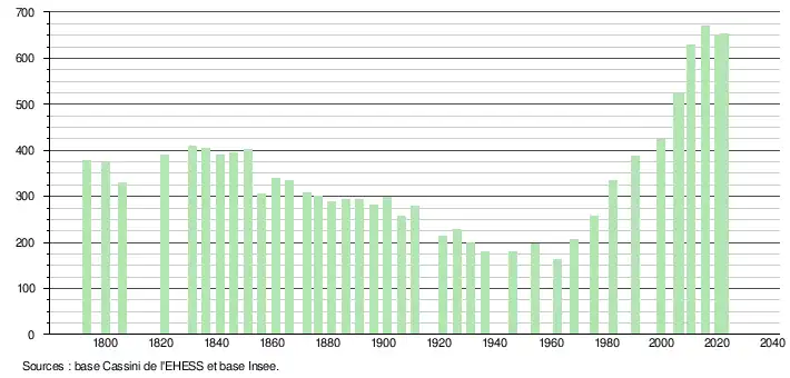 L'évolution du nombre d'habitants est connue à travers les recensements de la population effectués dans la commune depuis 1793. Pour les communes de moins de 10 000 habitants, une enquête de recensement portant sur toute la population est réalisée tous les cinq ans, les populations de référence des années intermédiaires étant quant à elles estimées par interpolation ou extrapolation[18]. Pour la commune, le premier recensement exhaustif entrant dans le cadre du nouveau dispositif a été réalisé en 2005[19].