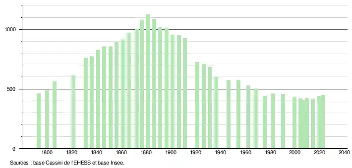 L'évolution du nombre d'habitants est connue à travers les recensements de la population effectués dans la commune depuis 1793. Pour les communes de moins de 10 000 habitants, une enquête de recensement portant sur toute la population est réalisée tous les cinq ans, les populations de référence des années intermédiaires étant quant à elles estimées par interpolation ou extrapolation[20]. Pour la commune, le premier recensement exhaustif entrant dans le cadre du nouveau dispositif a été réalisé en 2004[21].