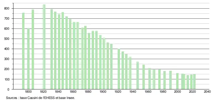 L'évolution du nombre d'habitants est connue à travers les recensements de la population effectués dans la commune depuis 1793. Pour les communes de moins de 10 000 habitants, une enquête de recensement portant sur toute la population est réalisée tous les cinq ans, les populations de référence des années intermédiaires étant quant à elles estimées par interpolation ou extrapolation[20]. Pour la commune, le premier recensement exhaustif entrant dans le cadre du nouveau dispositif a été réalisé en 2008[21].