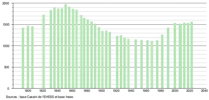 L'évolution du nombre d'habitants est connue à travers les recensements de la population effectués dans la commune depuis 1793. Pour les communes de moins de 10 000 habitants, une enquête de recensement portant sur toute la population est réalisée tous les cinq ans, les populations de référence des années intermédiaires étant quant à elles estimées par interpolation ou extrapolation[38]. Pour la commune, le premier recensement exhaustif entrant dans le cadre du nouveau dispositif a été réalisé en 2007[39].