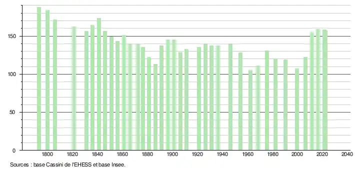 L'évolution du nombre d'habitants est connue à travers les recensements de la population effectués dans la commune depuis 1793. Pour les communes de moins de 10 000 habitants, une enquête de recensement portant sur toute la population est réalisée tous les cinq ans, les populations de référence des années intermédiaires étant quant à elles estimées par interpolation ou extrapolation[31]. Pour la commune, le premier recensement exhaustif entrant dans le cadre du nouveau dispositif a été réalisé en 2006[32].