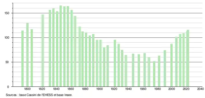 L'évolution du nombre d'habitants est connue à travers les recensements de la population effectués dans la commune depuis 1793. Pour les communes de moins de 10 000 habitants, une enquête de recensement portant sur toute la population est réalisée tous les cinq ans, les populations de référence des années intermédiaires étant quant à elles estimées par interpolation ou extrapolation[22]. Pour la commune, le premier recensement exhaustif entrant dans le cadre du nouveau dispositif a été réalisé en 2006[23].