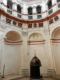 Le presbytère est conçu autour d'un portique carré avec quatre arcs de triomphe à double hauteur sur les axes, dans lequel une référence vitruvienne à l'ancien forum romain est perceptible[26].