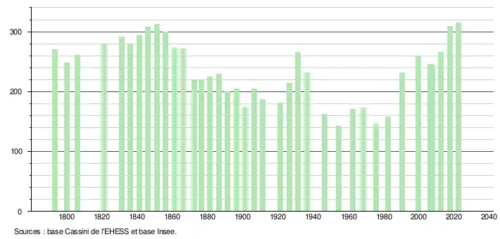 L'évolution du nombre d'habitants est connue à travers les recensements de la population effectués dans la commune depuis 1793. Pour les communes de moins de 10 000 habitants, une enquête de recensement portant sur toute la population est réalisée tous les cinq ans, les populations de référence des années intermédiaires étant quant à elles estimées par interpolation ou extrapolation[24]. Pour la commune, le premier recensement exhaustif entrant dans le cadre du nouveau dispositif a été réalisé en 2007[25].