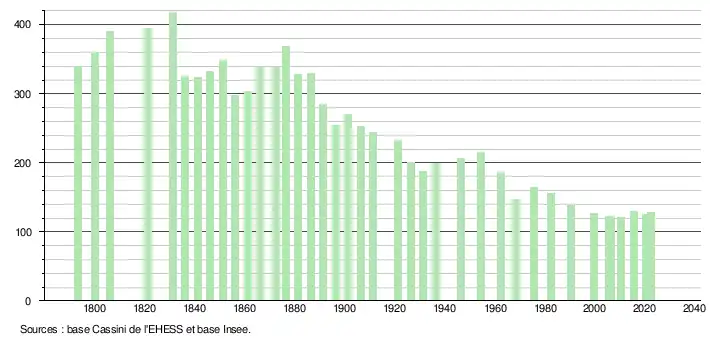 L'évolution du nombre d'habitants est connue à travers les recensements de la population effectués dans la commune depuis 1793. Pour les communes de moins de 10 000 habitants, une enquête de recensement portant sur toute la population est réalisée tous les cinq ans, les populations de référence des années intermédiaires étant quant à elles estimées par interpolation ou extrapolation[20]. Pour la commune, le premier recensement exhaustif entrant dans le cadre du nouveau dispositif a été réalisé en 2005[21].