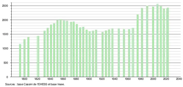 L'évolution du nombre d'habitants est connue à travers les recensements de la population effectués dans la commune depuis 1793. Pour les communes de moins de 10 000 habitants, une enquête de recensement portant sur toute la population est réalisée tous les cinq ans, les populations de référence des années intermédiaires étant quant à elles estimées par interpolation ou extrapolation[16]. Pour la commune, le premier recensement exhaustif entrant dans le cadre du nouveau dispositif a été réalisé en 2006[17].