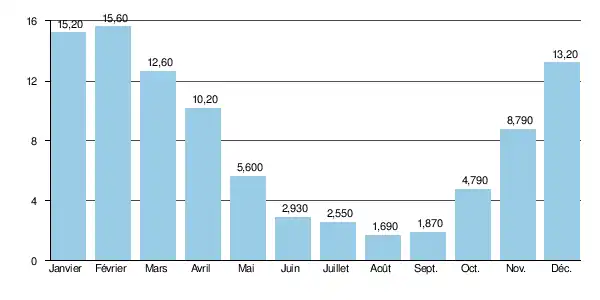 La rivière présente d'importantes fluctuations saisonnières de débit, avec des hautes eaux d'hiver de 12,6 à 15,6 m3 en moyenne mensuelle, de décembre à mars inclus (maximum en février), et des maigres d'été, en juillet-août-septembre, avec une chute du débit moyen mensuel allant jusqu'à 1,69 m3 au mois d'août.