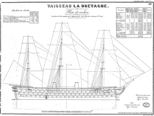 - ↑ Bien que celui-ci comportât une bouche à feu supplémentaire, la Bretagne le surpassait tant par ses dimensions et son déplacement que par sa vitesse et le poids de sa bordée