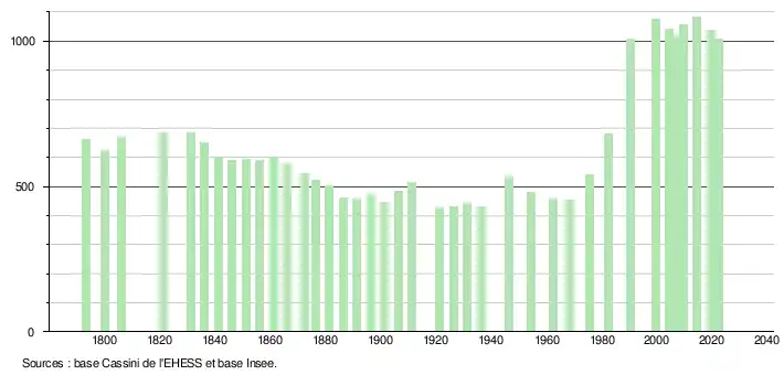 L'évolution du nombre d'habitants est connue à travers les recensements de la population effectués dans la commune depuis 1793. Pour les communes de moins de 10 000 habitants, une enquête de recensement portant sur toute la population est réalisée tous les cinq ans, les populations de référence des années intermédiaires étant quant à elles estimées par interpolation ou extrapolation[30]. Pour la commune, le premier recensement exhaustif entrant dans le cadre du nouveau dispositif a été réalisé en 2004[31].